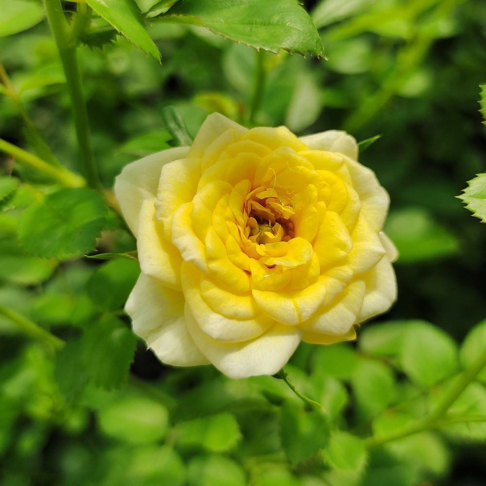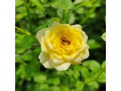 Яркий желтый цвет, со временем выгорает до кремового, цветок махровый, в соцветиях до 30 шт. Куст фонтанообразный, активно используется как почвопокровная роза на первом плане посадок.